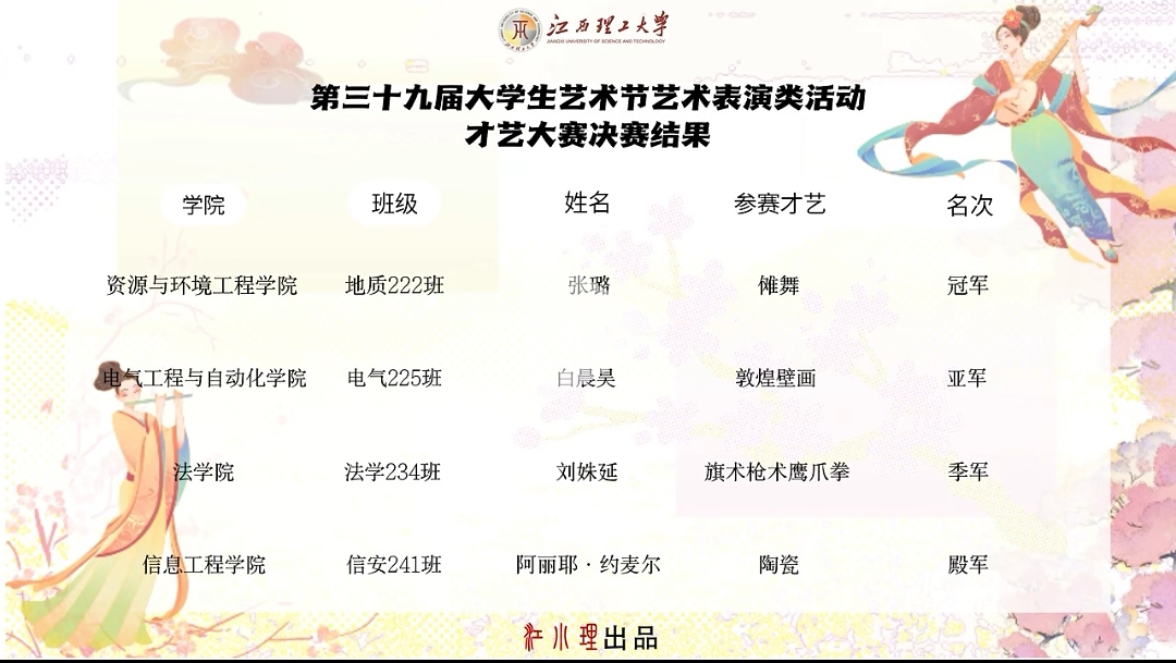 本网讯 近日,由校团委、教务处、国际教育学院主办,大学生新媒体中心承办的校第三十九届大学生艺术节之才艺大赛圆满帷幕,学院地质222班张璐同学经过四轮比拼,凭借精彩表现,力压群雄,斩获本次大赛的冠军。